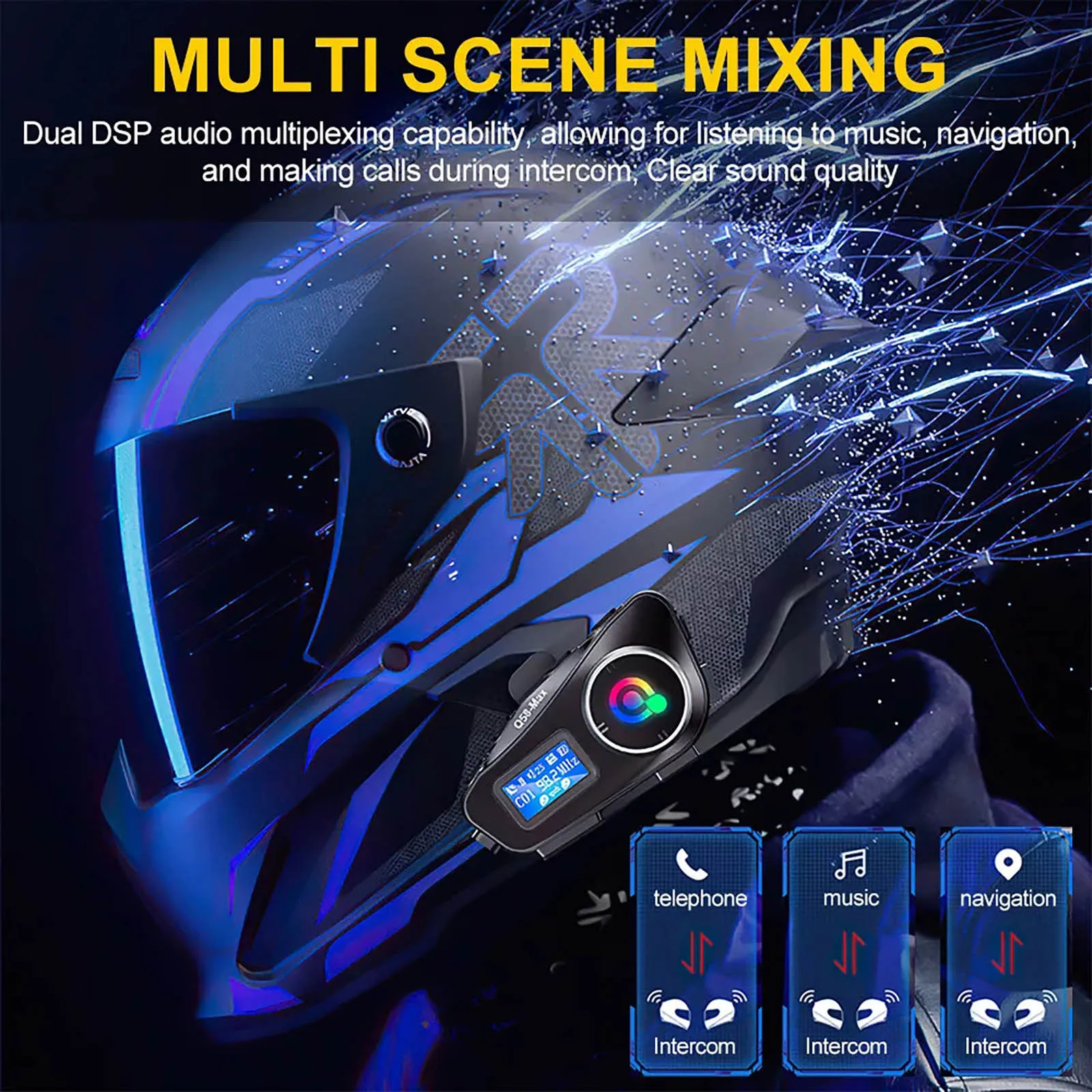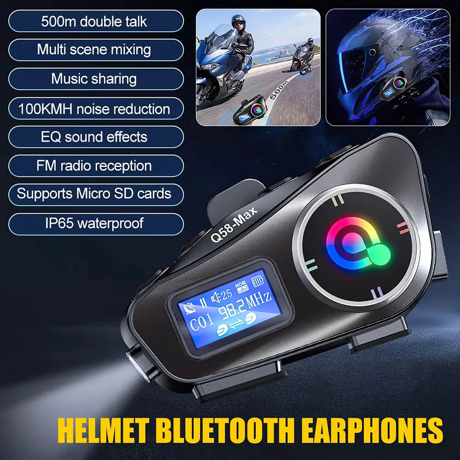 Hi-Fi Unit Dual-core chip BT5.3+BT5.3 EQ high-fidelity Motorcycle Helmet Bluetooth 500m Intercom Distance LCD Bluetooth Headset